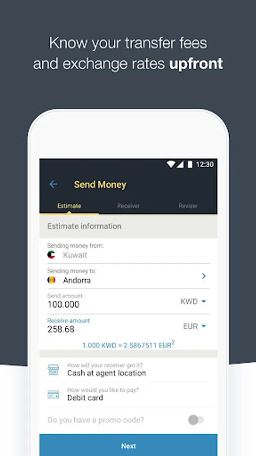 • Transfer money in minutes** anytime from your mobile device. Use your debit card issued in Kuwait to fund your transfers.