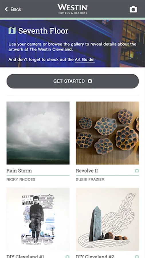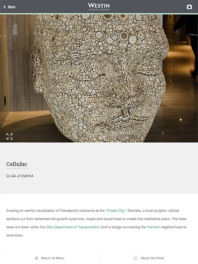 The Westin CLE Art Tour app allows hotel guests to browse the artwork on display at the Westin Cleveland Downtown. The app uses augmented reality to show information about each piece and the artist. Just walk around the hotel and point your device's camera at the piece of art you'd like to learn more about. The app also allows your browse the gallery from the comfort of your own room.