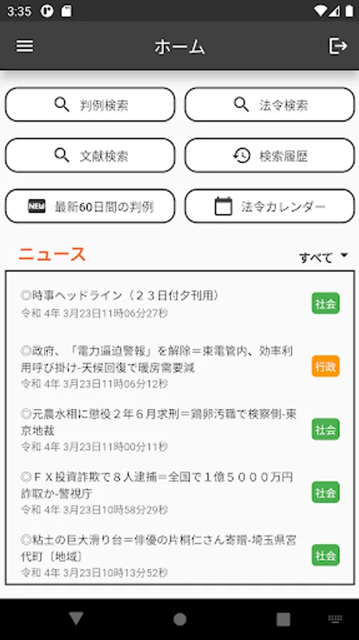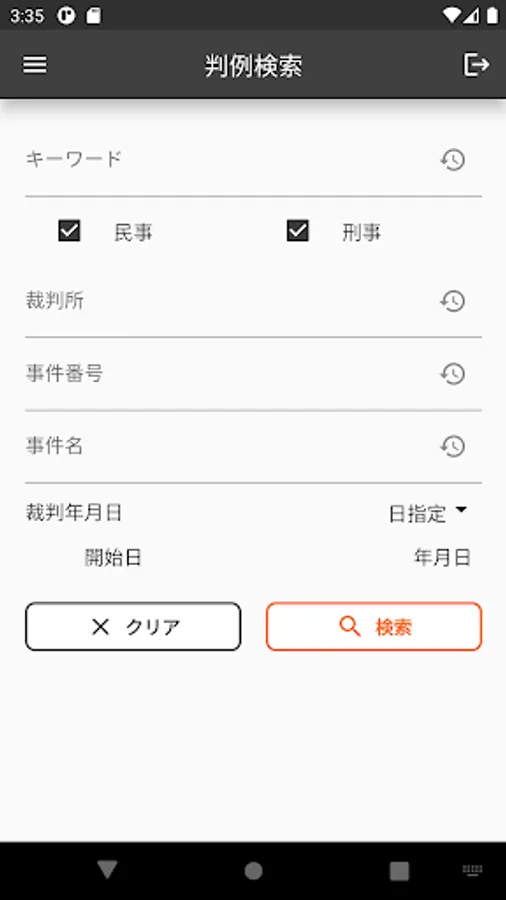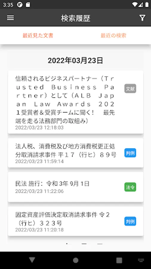 Since it automatically synchronizes with the search history of the PC version of "Westlaw Japan", it is possible to efficiently check the contents searched on the PC at work or at home on the go (after logging in to this application, the first screen is displayed. Click the "Search History" button to see the synchronized history).