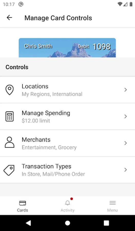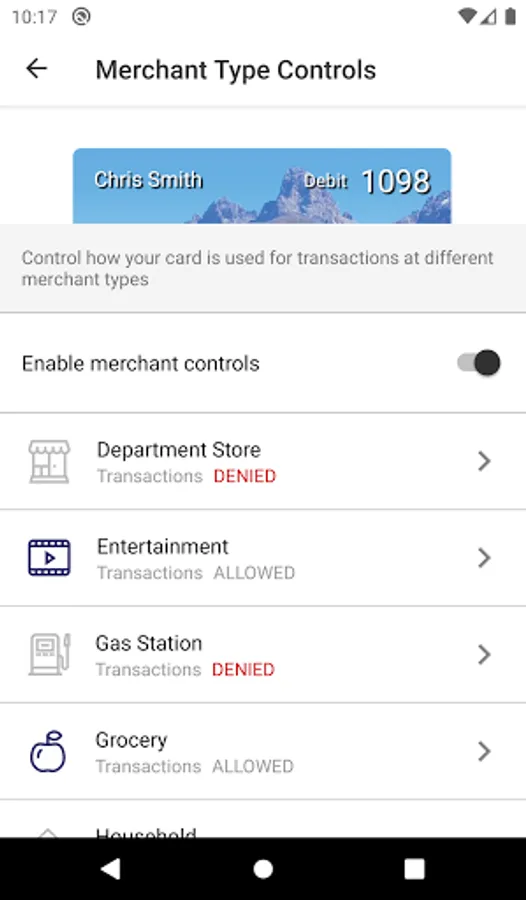 Spending limits can be established to allow transactions up to a certain dollar value and decline transactions when amounts exceed your defined thresholds. Transactions can be monitored and managed for specific merchant categories such as gas stations, department stores, restaurants entertainment, travel, and groceries. And your transactions can also be monitored for specific transaction types: in-store purchases, e-commerce transactions, mail/phone orders and ATM transactions.