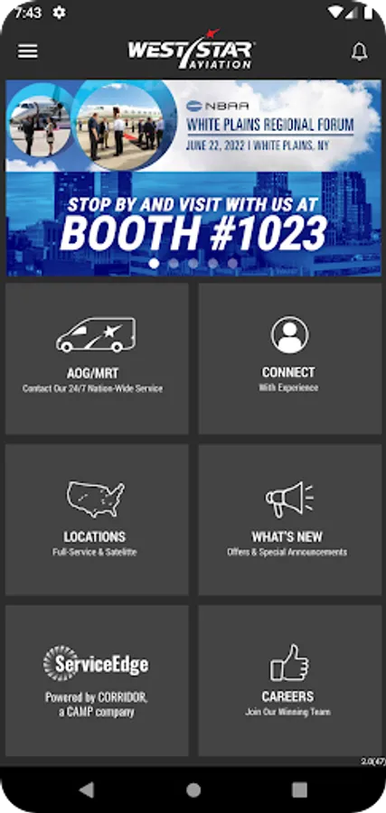 With a few simple taps, the "Connect With Experience" mobile app provides a direct contact with the appropriate experienced West Star Aviation personnel, for the award winning aircraft service you need, when you need it, at a location convenient to you.