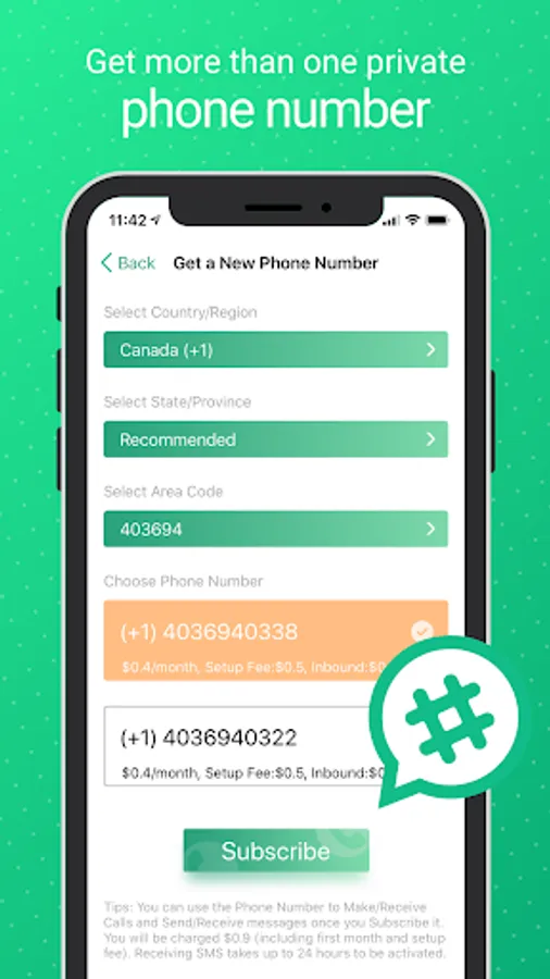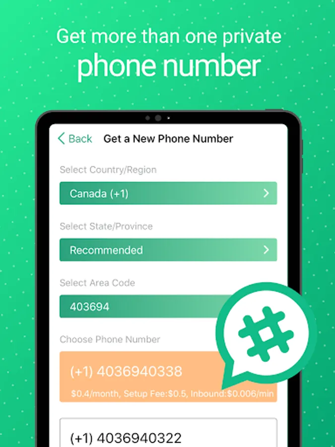 • Get a second phone number from any USA/Canada region