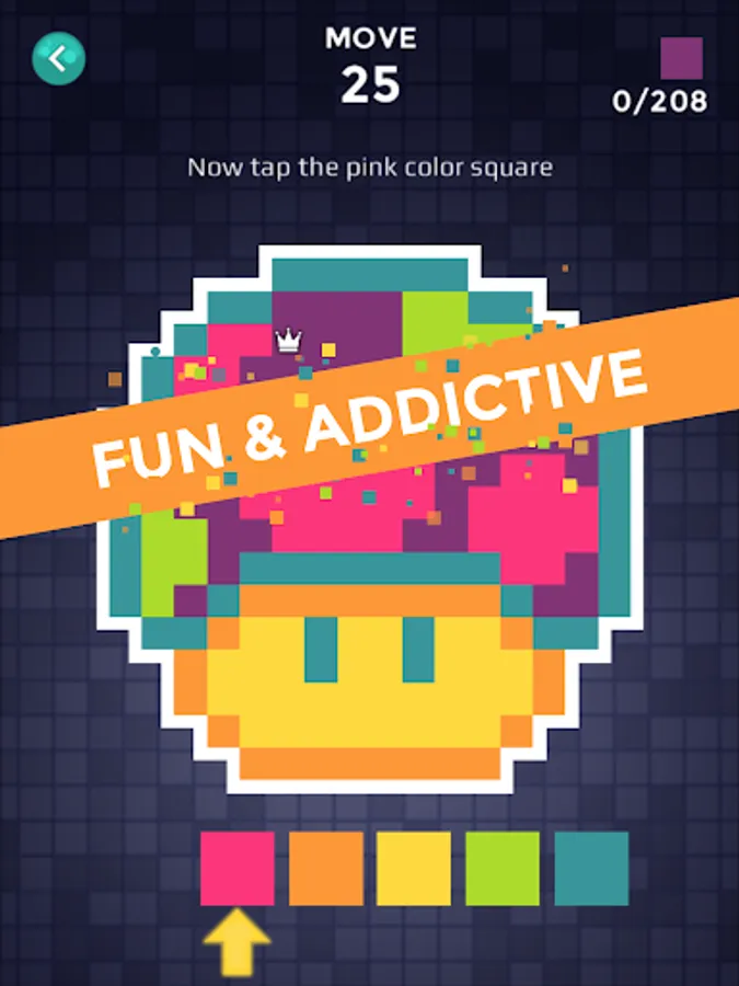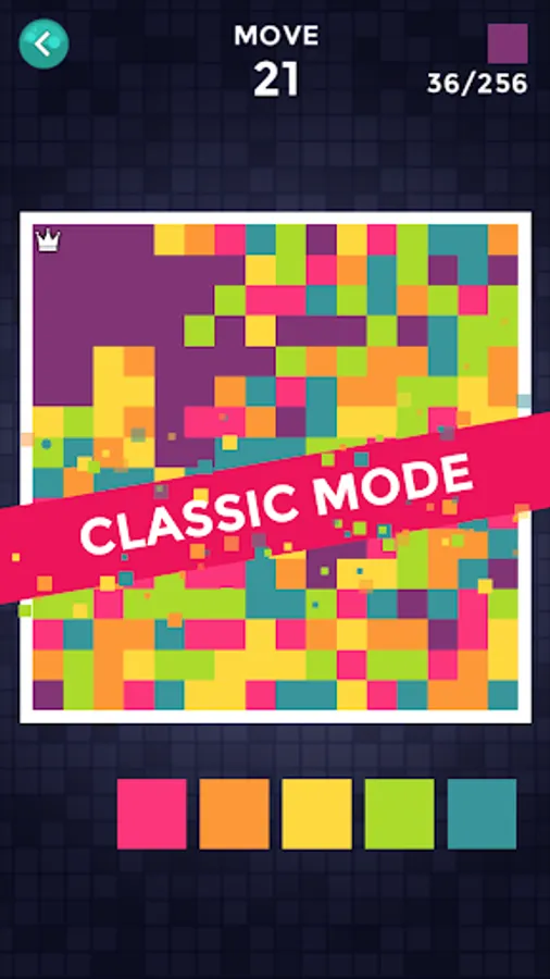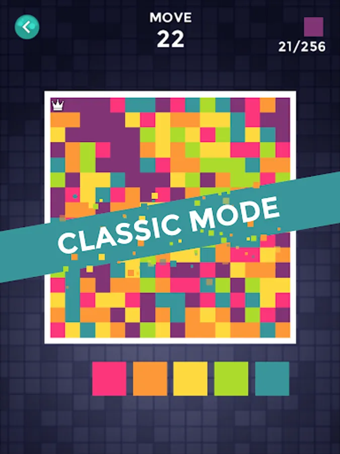 The objective of this game is to flood fill the entire board with one color. The flood starts at a square with crown icon on the board. Tap any color in the row of colors below the board to change the color of the current square. Continue flooding until the whole board turns to one color. The game is over if player fails to flood the board within the move limits.