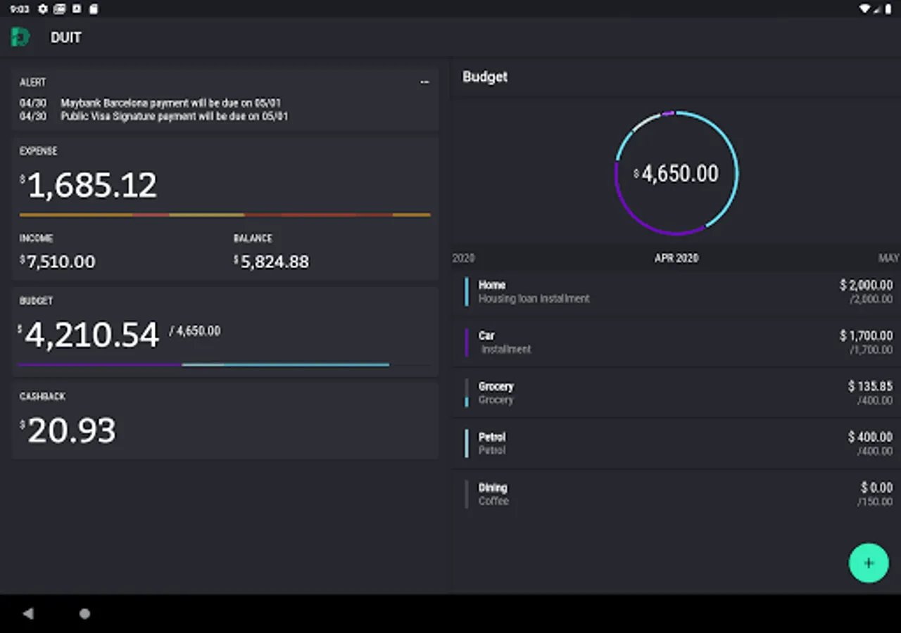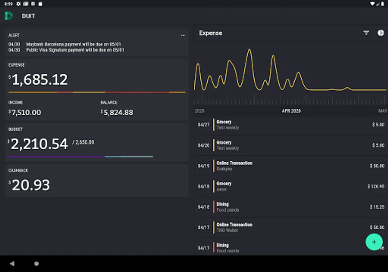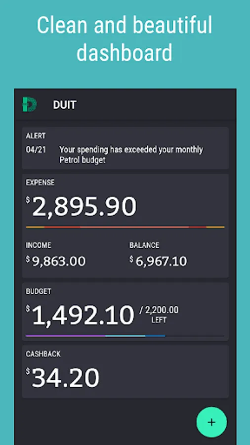 Duit is a personal finance app that helps to manage and track your income, expense, budget and credit card cashback.