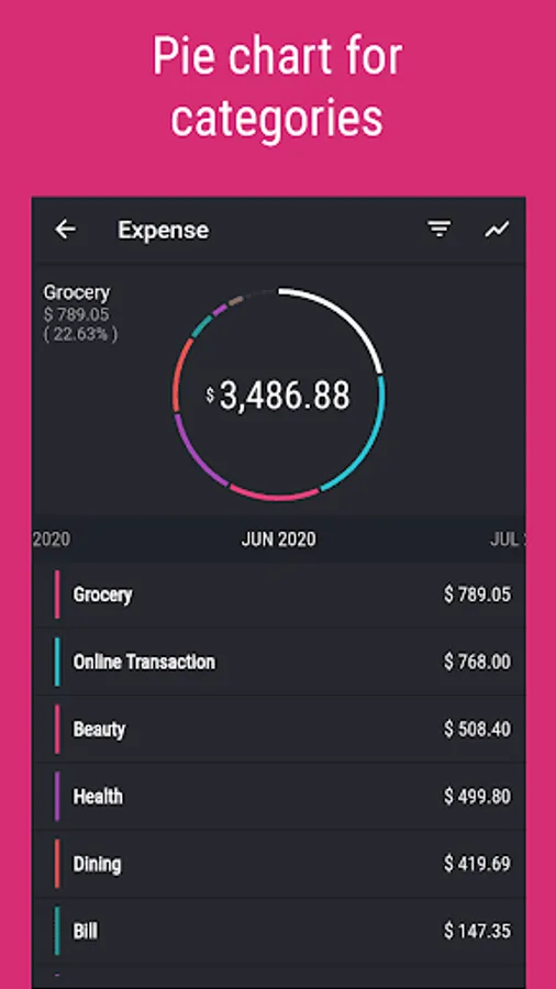 - Monthly pie chart to show transactions based on categories. Tap on category to show details.