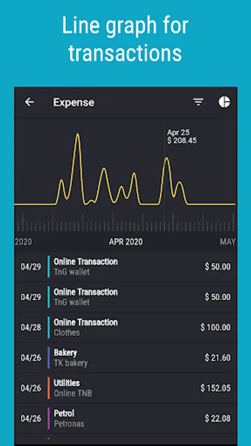 - Monthly graphs to show transactions. Long press to show transaction details.