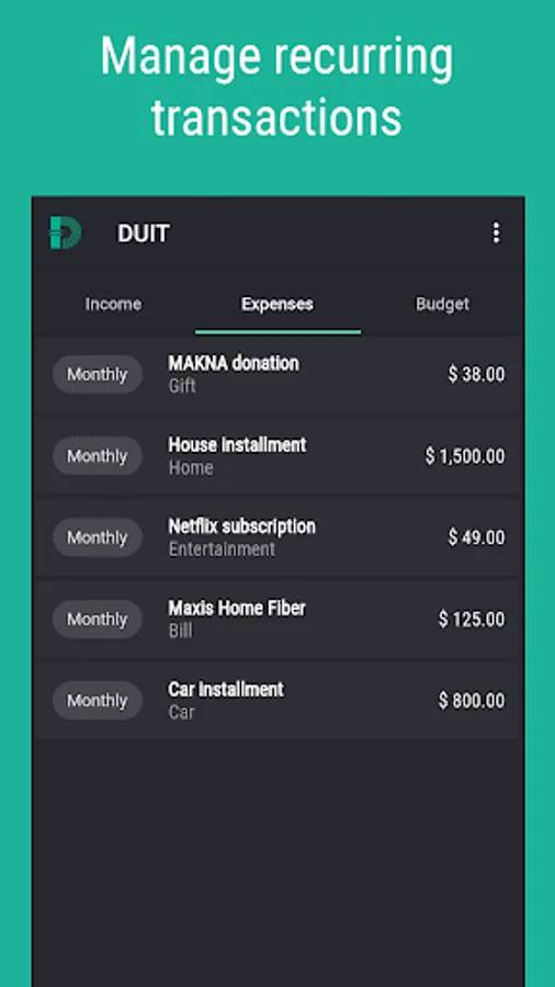 - Set recurring transactions (daily, weekly, monthly for income and expense; monthly for budget)
