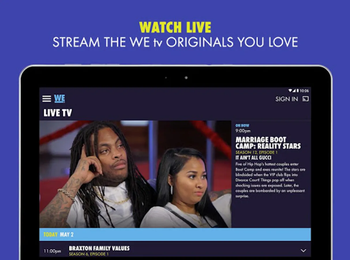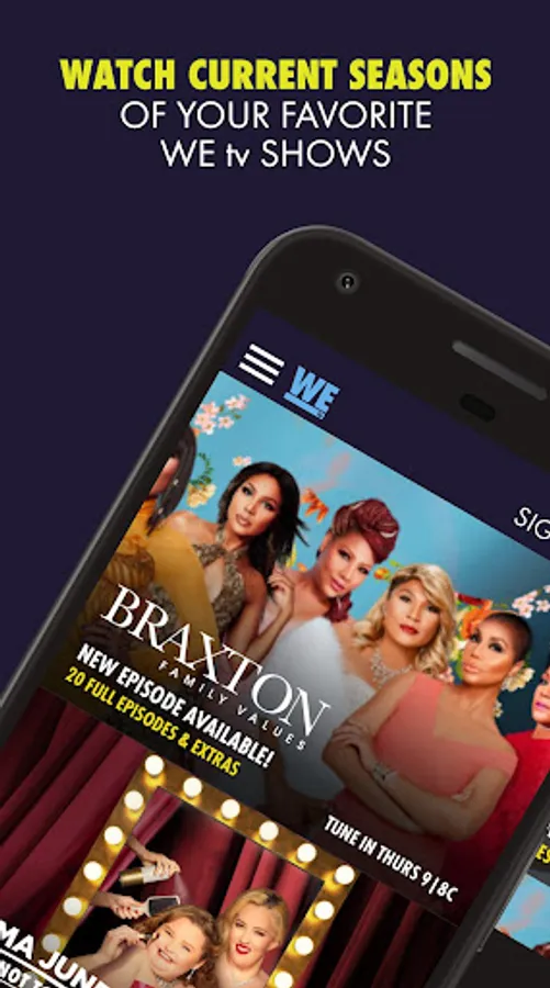 Sign in with your cable provider to get your WE tv fix whenever and wherever you want it! Find new favorites, stream Live TV, and watch the latest full episodes and video extras from WE tv ‘s Original Series. No login is needed for select content including season premieres and video extras like trailers, sneak peaks, and deleted scenes!