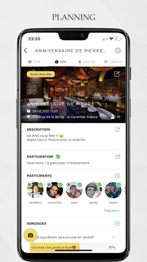 Survey, List of tasks, Budget, Expense, Chat, Validation of guests, Location, Date and much more.