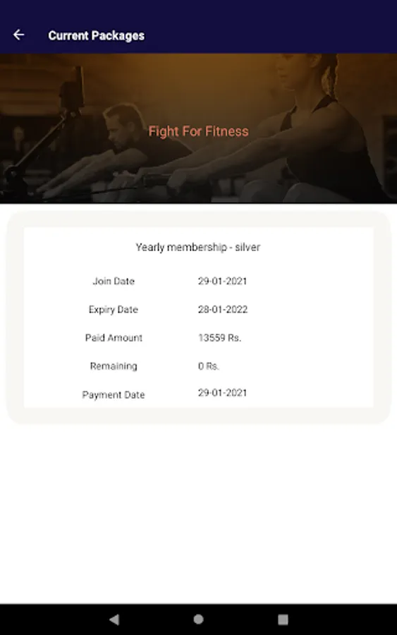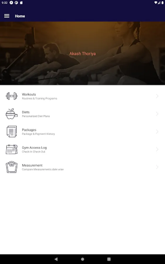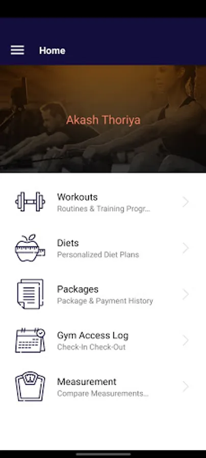 Members can view their Workouts, Diets, Access Log, Measurements, Profile and pop inquire for Personal Training.