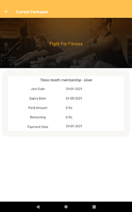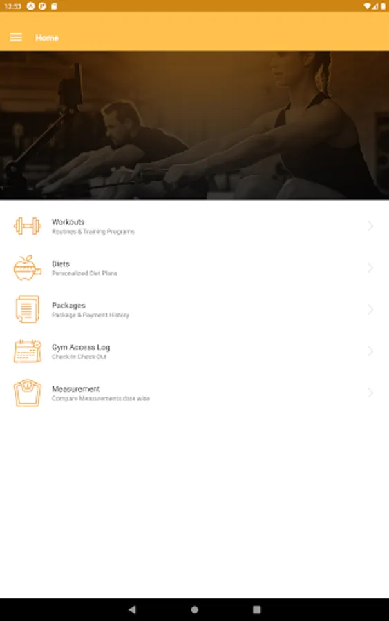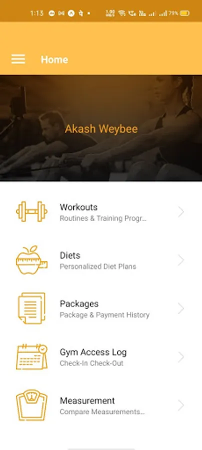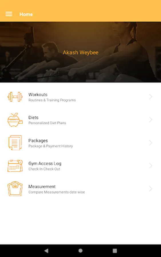 Members can view their Workouts, Diets, Access Log, Measurements, Profile and pop inquire for Personal Training.