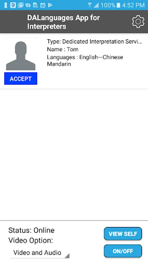 The DAL Interpreter app allows professional interpreters to manage their schedule of availability and accept requests for Video Remote Interpretation (VRI) or Voice Only (VO) interpretation services.