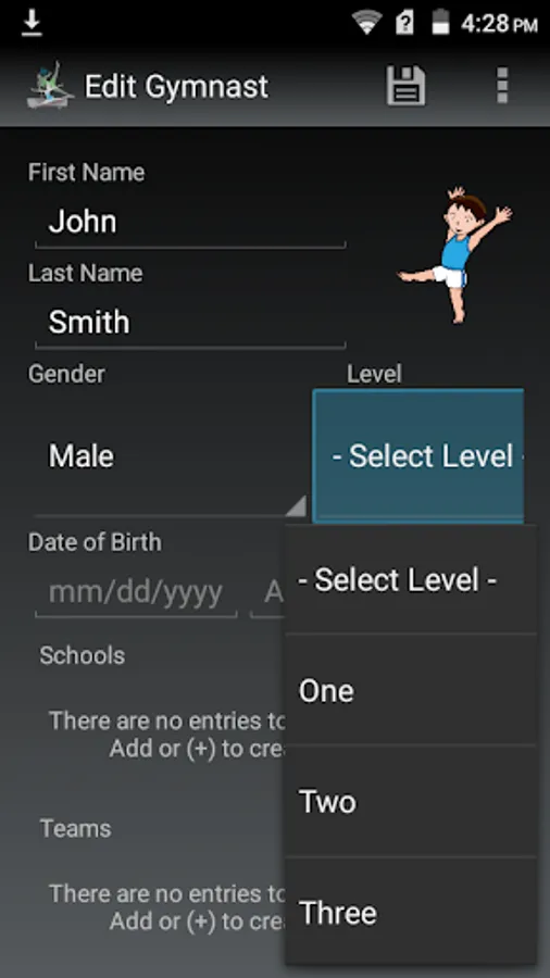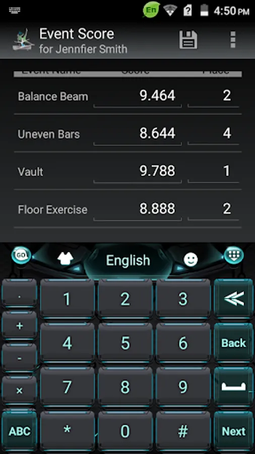 Gymnast Companion is a powerful application for any Gymnastics Enthusiast, including professional and non-professional gymnasts, coaches, score keepers or anyone who wants to keep track of scores. It provides capabilities to collect scores for a gymnast of any level. It includes the features to gather scores for multiple gymnasts, teams or even for any number of schools.