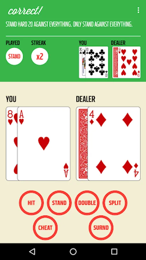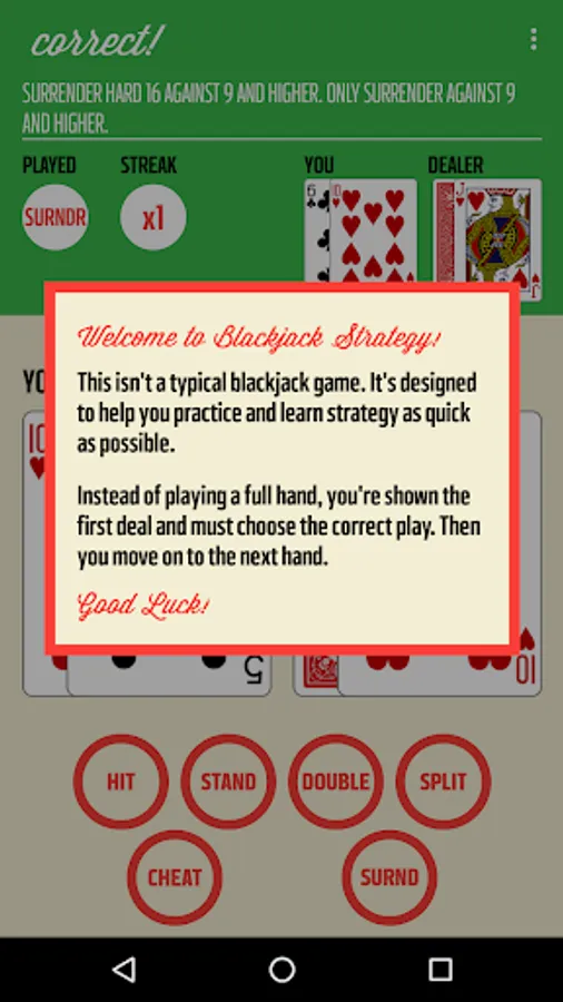 Learn perfect Blackjack strategy quickly and easily! Maximize your casino edge by playing every kind of hand or just the ones you want to improve on. Get immediate feedback on each and every move. Automatically track your accuracy, hot streaks, and detailed stats.