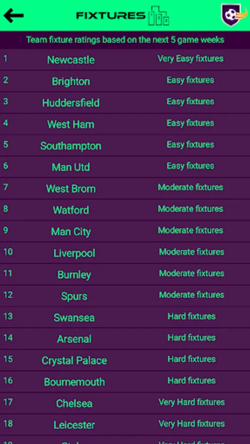The final page produces a league table ranking teams on their upcoming fixtures giving you the chance to simply review who has the easy games.