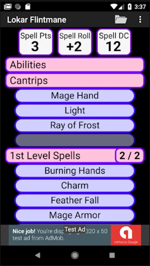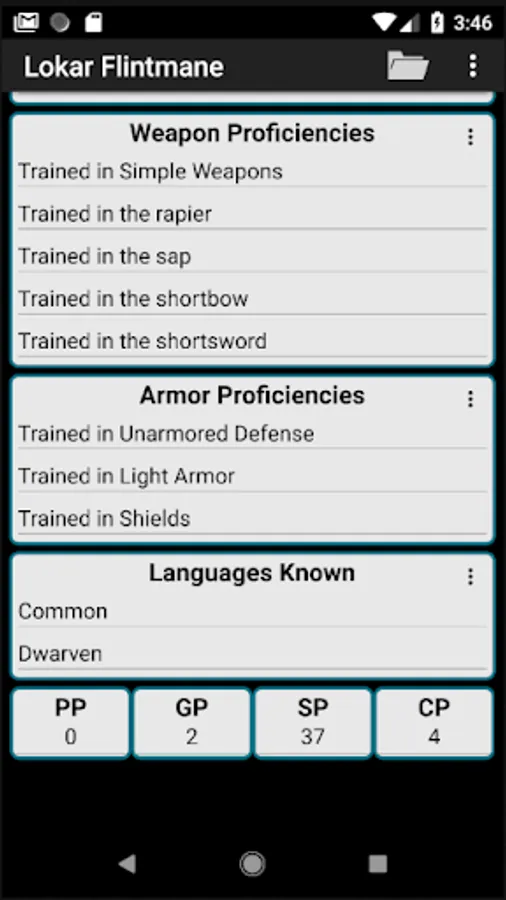 - Spell book with spell attack bonuses, spell DC, and spell slots tracking
