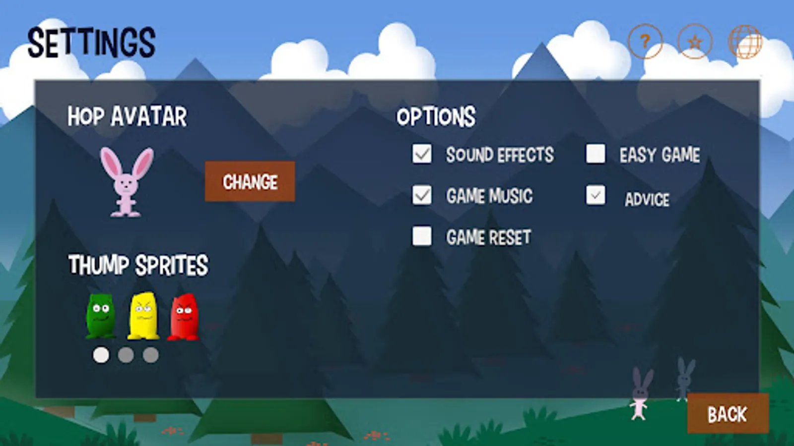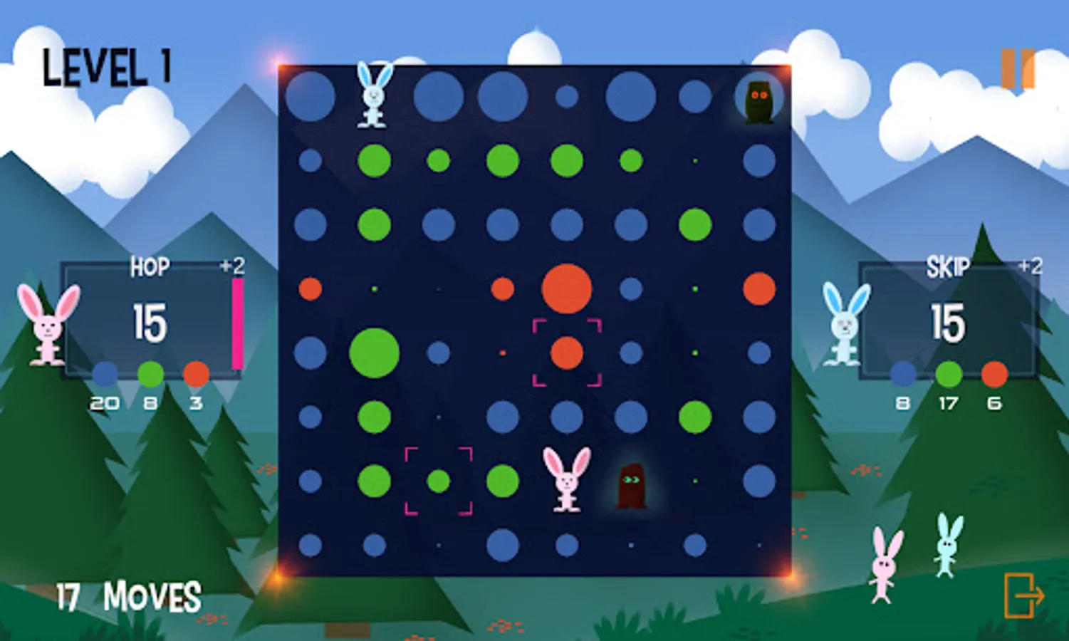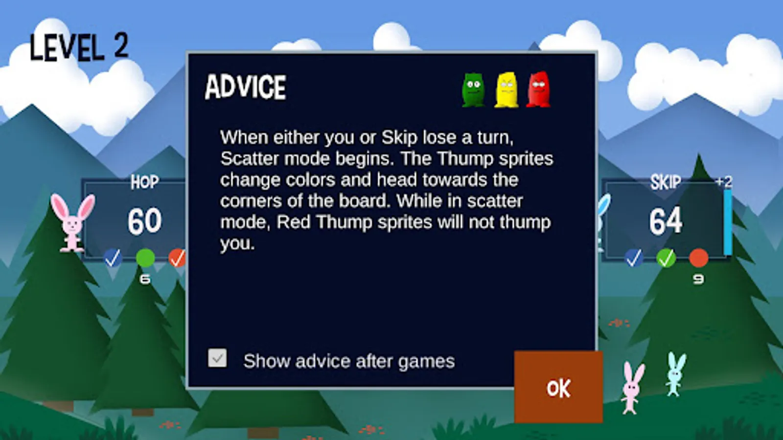 You play this turn-based, puzzle-like strategy game as a rabbit named "Hop". Your opponent is "Skip". The object of the game is to jump around on the game board, score points, and beat Skip. Also on the board are playful AI creatures called “Thump". Some move about randomly while others actively try to block your moves. And beware the red ones. If they touch you, you are thumped and lose a turn.