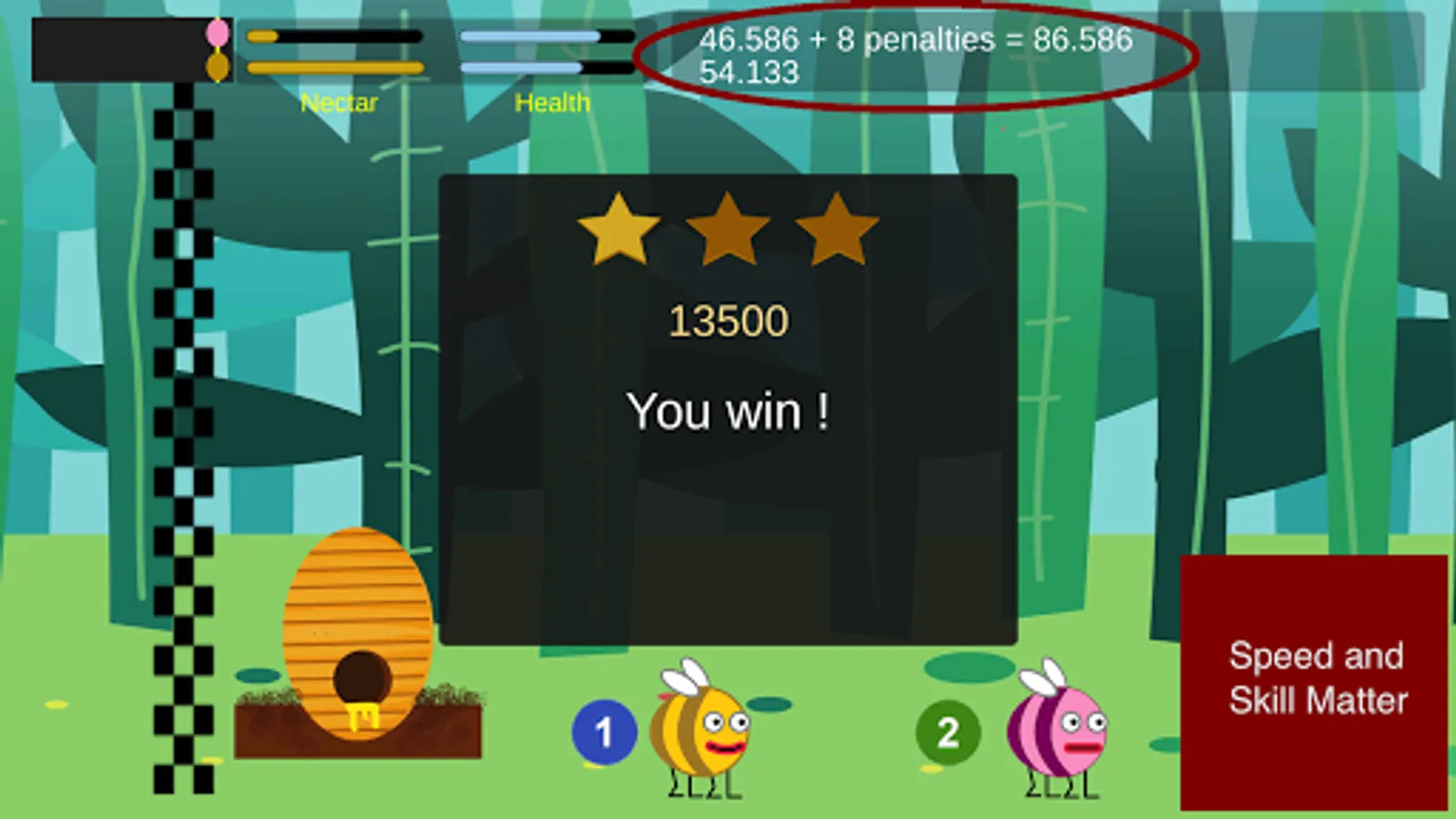 In Wing Leader, speed is not the only factor in winning. Being first to the hive does not guarantee victory in a race. Your bee must collect nectar from flowers along the way. The hive expects a full load of nectar to be delivered. Anything less than that and penalty time will be added to your finish time. The winner of the race is the bee with the lowest adjusted time.
