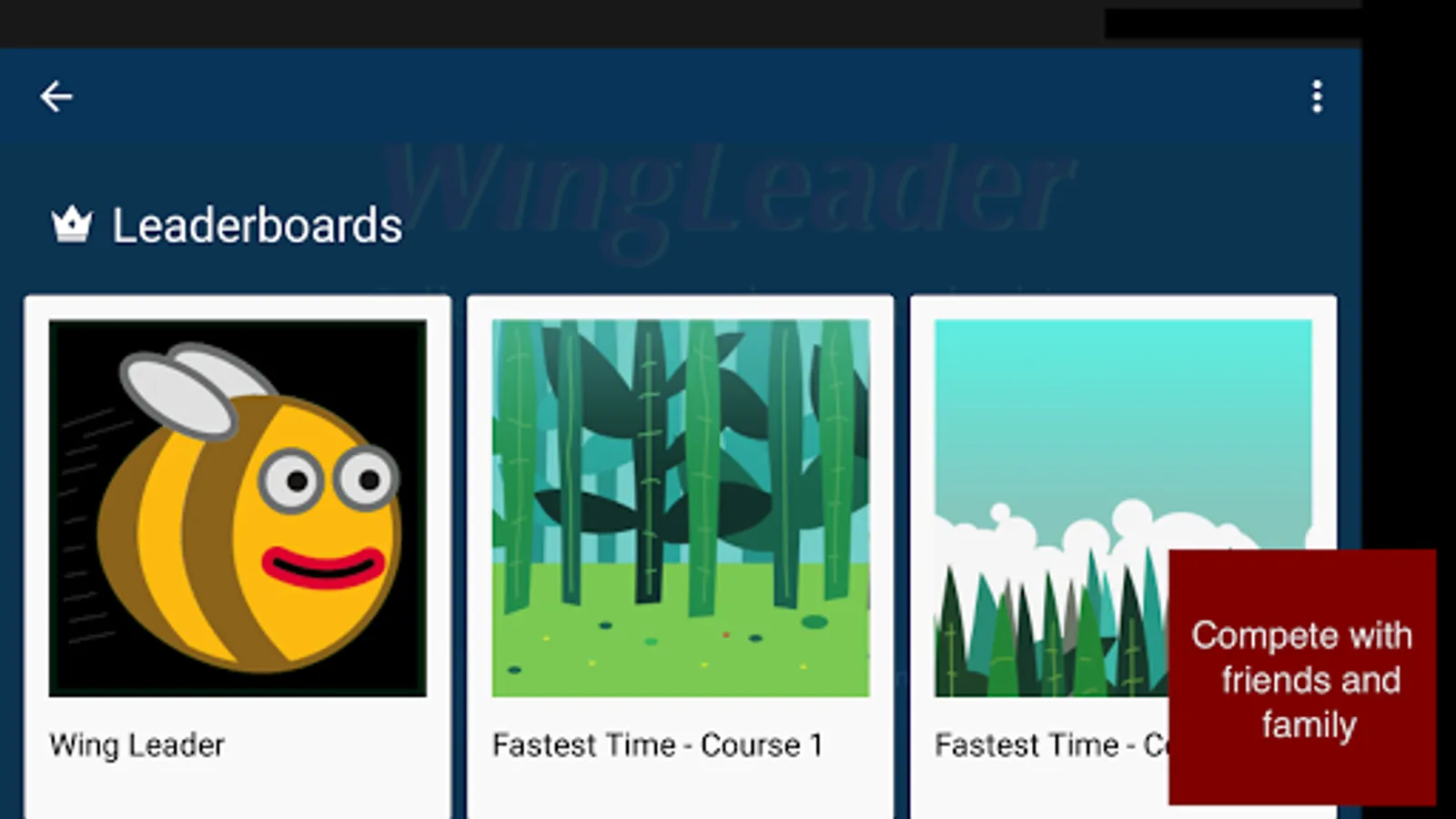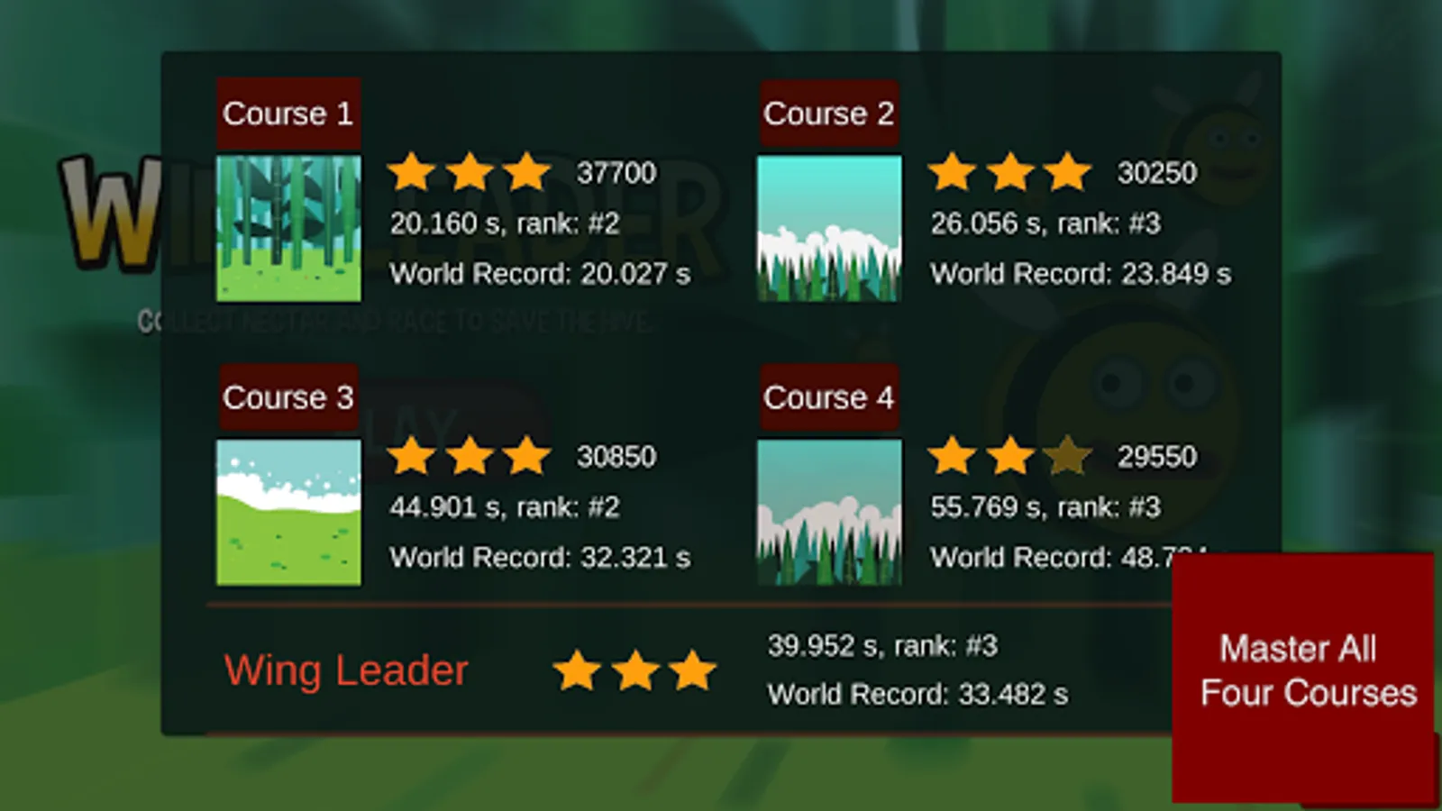 To be Wing Leader, your bee has to be the fastest bee in the world. On the screen, it is you against an AI bee, but what's really important is your time, relative to other people playing the game. Check the leaderboards to see where you stand on each of the four courses. Then check the Wing Leader leaderboard. The bee with the lowest, average time across all courses is the Wing Leader.