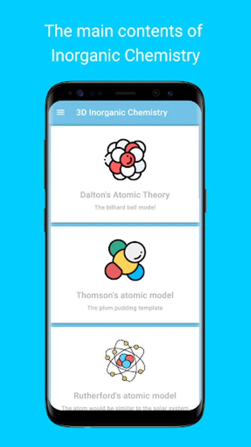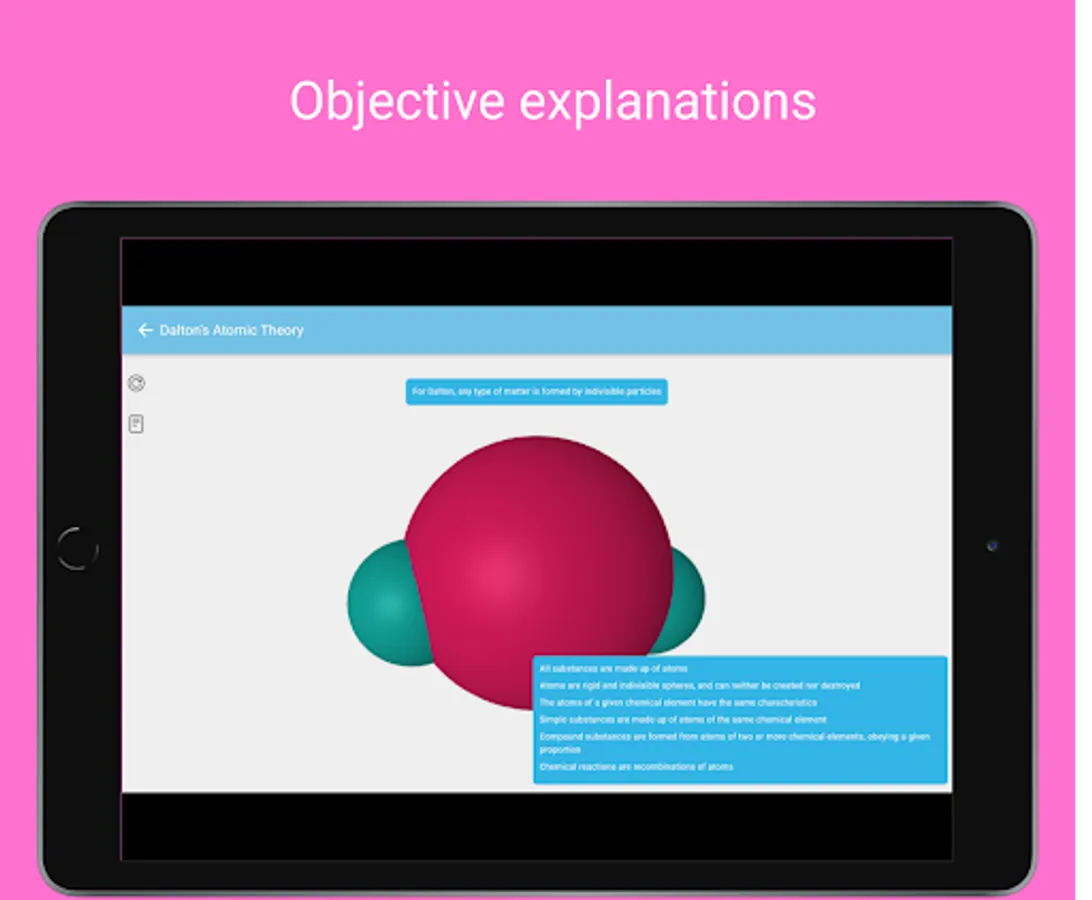 The Chemistry 3D I - Dalton application presents the main contents of inorganic chemistry present in the basic course of Chemistry I. It aims to make students understand such contents through a 3D visualization and presenting the theoretical topics in a simple and objective way.