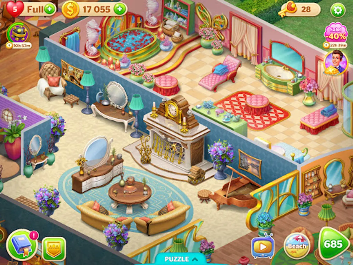 In each level, there is a puzzle to solve by matching two or more identical elements. Solve the colorful puzzles to renovate and decorate the hotel by selecting your signature style for its interiors. Ever wanted to decorate your own mansion? Have a blast choosing from hundreds of customizable interior designs. Transform this mysterious place to your heart’s desire!