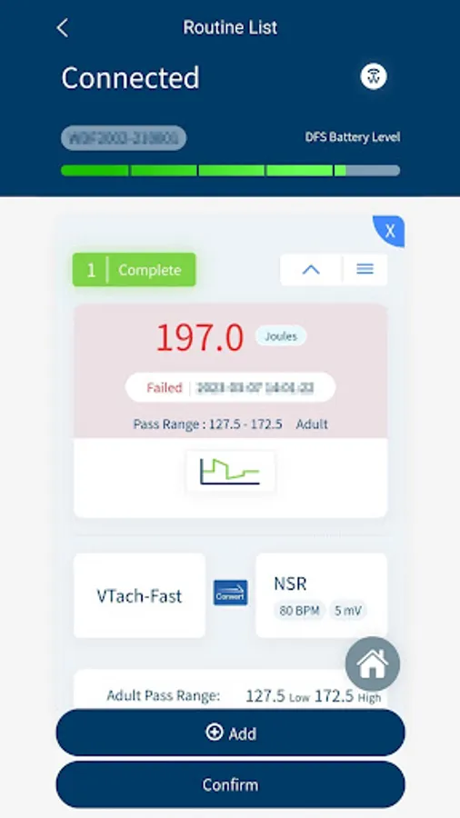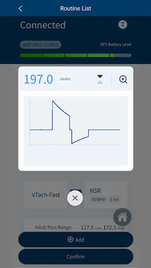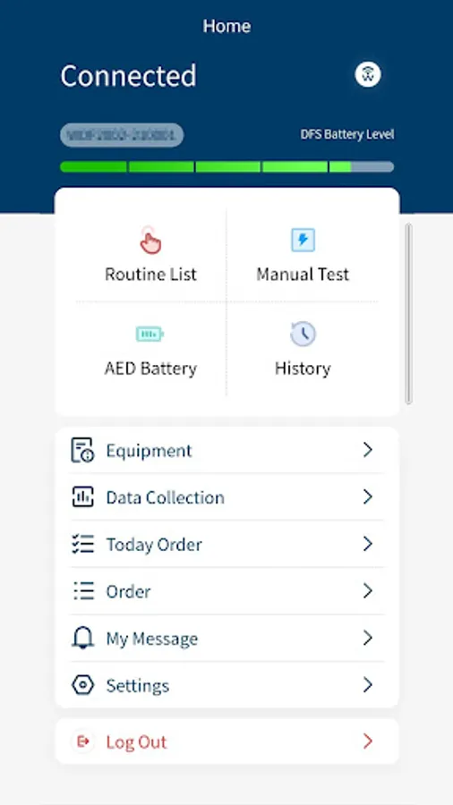 E. Settings: include DFS Management, 3 Consecutive Defibrillation, Reset, Language Switch, Terms & Conditions of Use, Privacy Policy, and APP version.