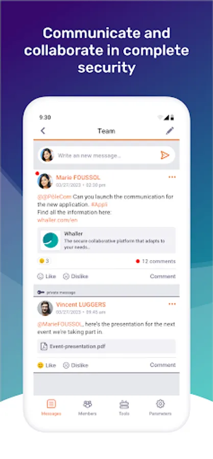 With the mobile application, access many of the options available on the web version of Whaller (whaller.com):