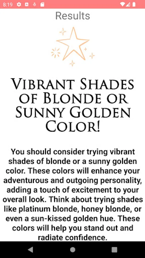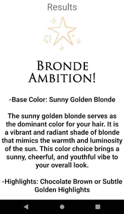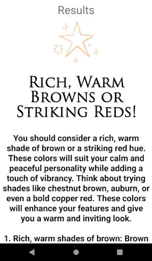 - Hair Color Recommendations: A captivating quiz app that unravels the secrets of colors to help you find your perfect hair color. The app will suggest a range of hair colors that will beautifully harmonize with your complexion, ensuring a stunning transformation that turns heads.