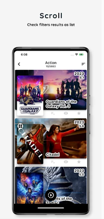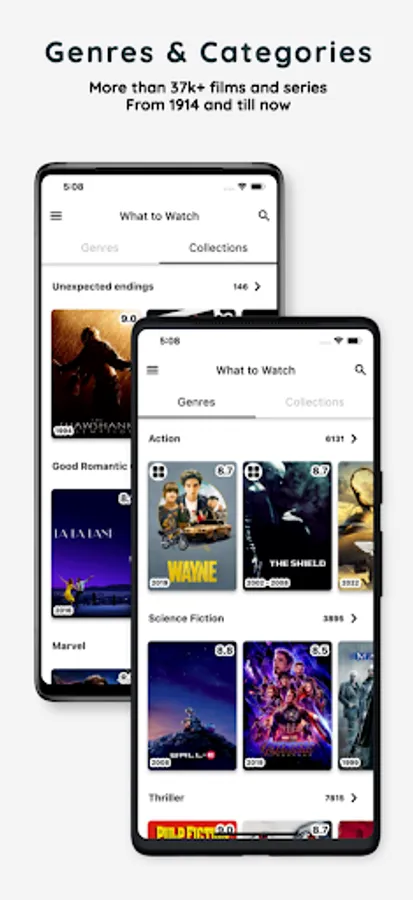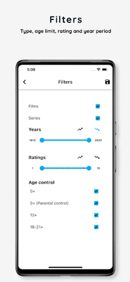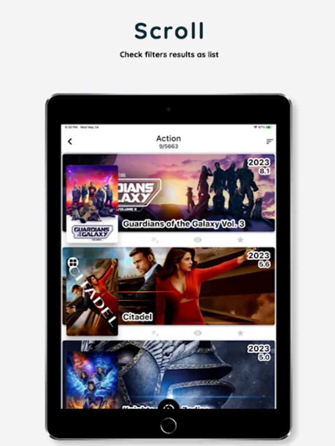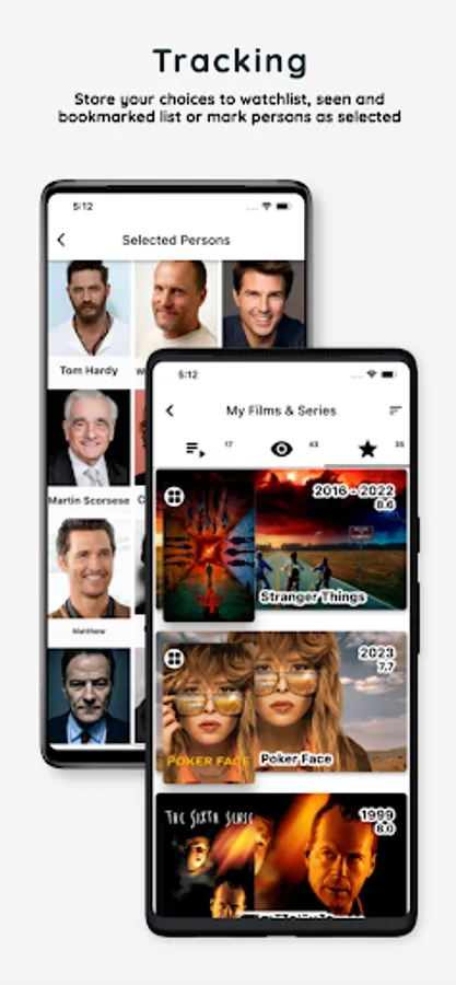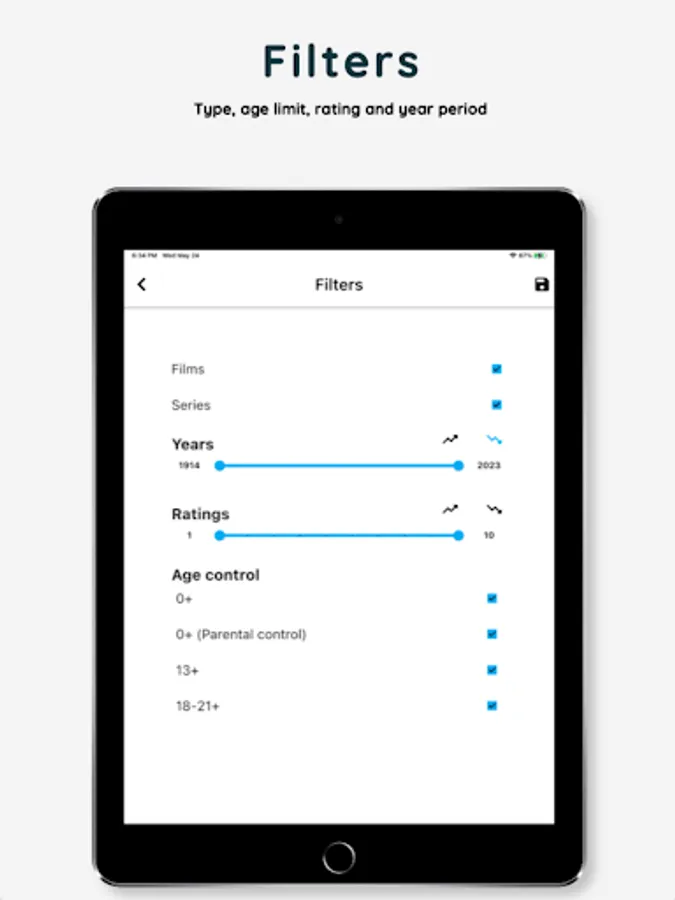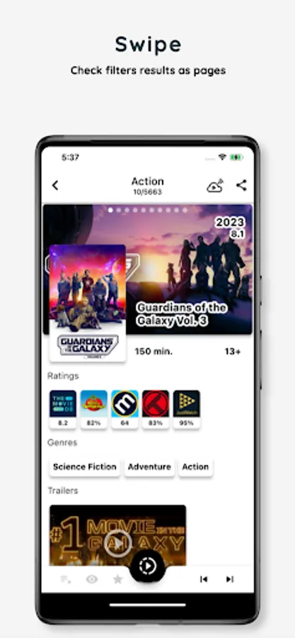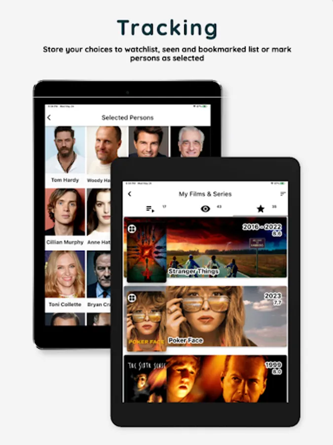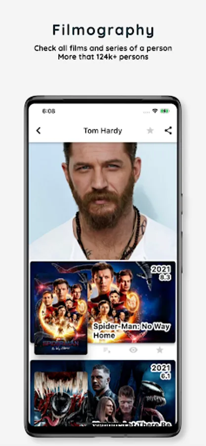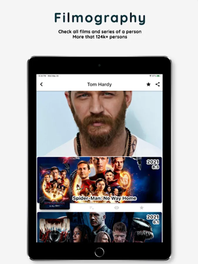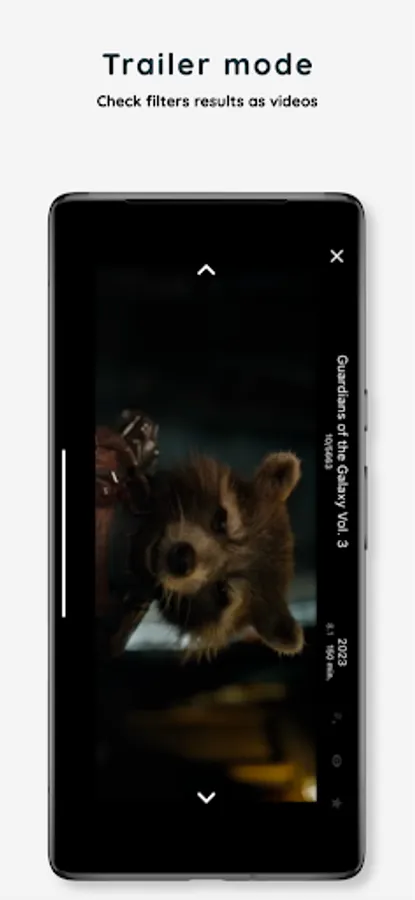 The fundament of app is simple and convenient search for movies and series by genres or collections. The main difference between the application is Trailer mode, it's the ability to search movies when viewing trailers of a specific genre or collection, reminiscent of watching trailers to new movies before the session in the cinema. At the same time there is a possibility to view the complete information of all films. Selected movies can be added to your profile's collections: watchlist, seen and bookmarked list from list and pages. You also can check filmography of more then 170 000 persons, actors and directors.