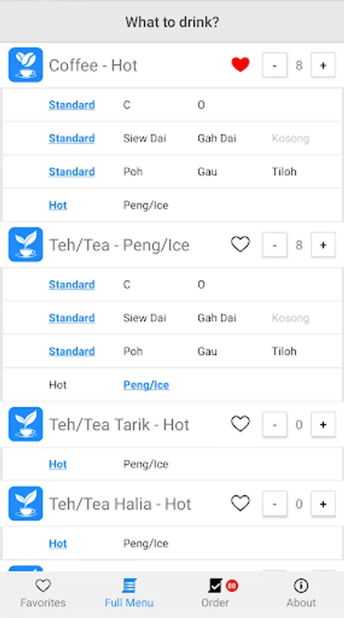 Kopi C Siew Dai x2, Teh O Kosong Peng x 4, Yuanyang x 3, etc...