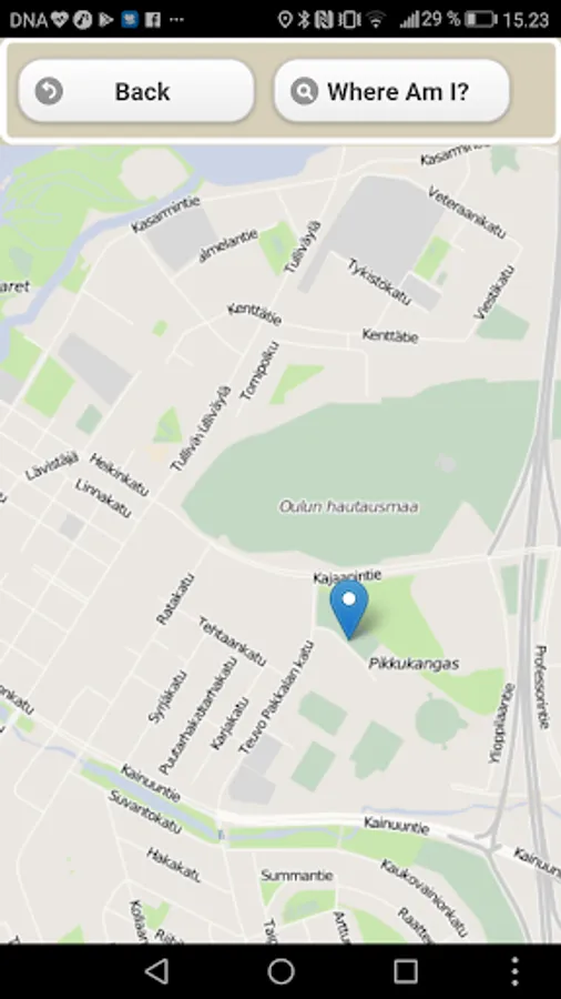 The user has access to the maps of the Oulu and region. On the location service, the user can see their own location on the map.