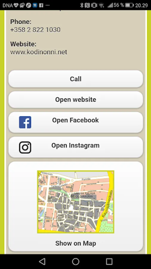 The app is easy to use. The user can switch between the main headings and company specific data using the Back button or the phone’s own back arrow button. The Call, Open website and Show on Map buttons can also be used to phone a company or switch to their website or location on the map. The Search function at the bottom of the main section is useful if the user wants to search for a service or operator by a specific word.