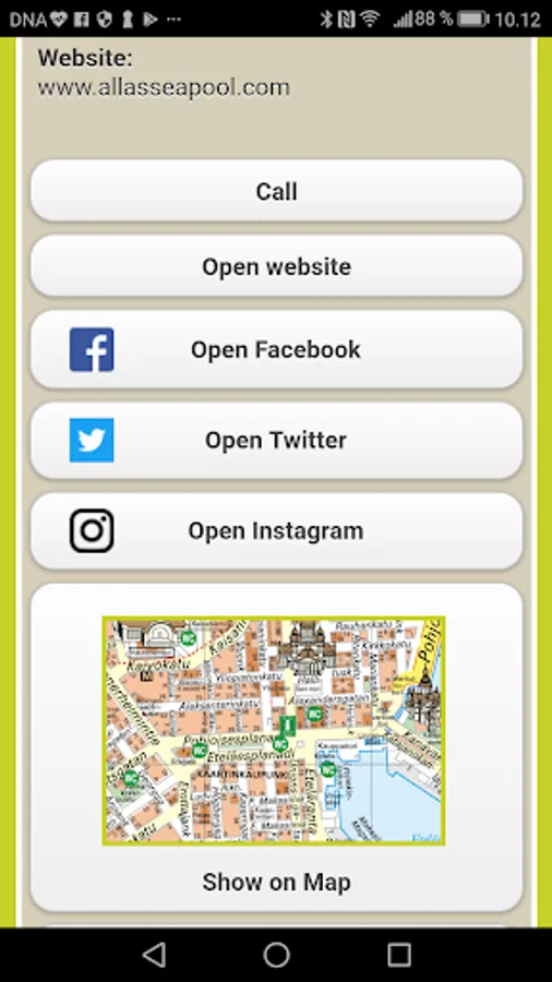 The app is easy to use. The user can switch between the main headings and company specific data using the Back button or the phone’s own back arrow button. The Call, Open website and Show on Map buttons can also be used to phone a company or switch to their website or location on the map. The Search function at the bottom of the main section is useful if the user wants to search for a service or operator by a specific word.