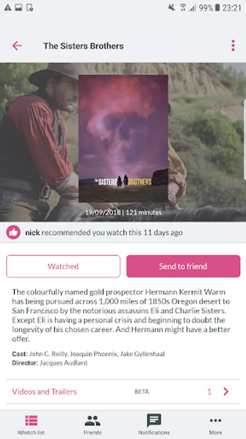 Search for Films and TV shows and add them to your Whatch list, and once watched, add a rating and send recommendations to your friends.