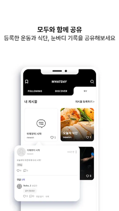 From exercise/meal management/change records, you can form a healthy lifestyle with various users with WHATDAY.