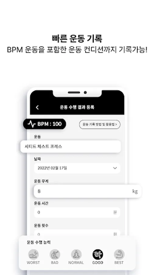 Exercise time recording function such as exercise time and BPM exercise setting, exercise record