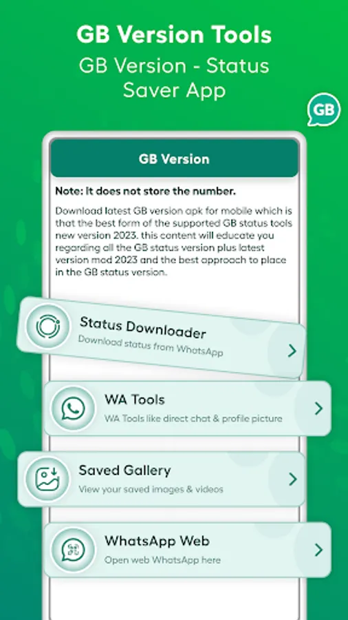 GB Version - Status Saver 2023 app is not affiliated with, sponsored, or endorsed by WhatsApp, Inc.