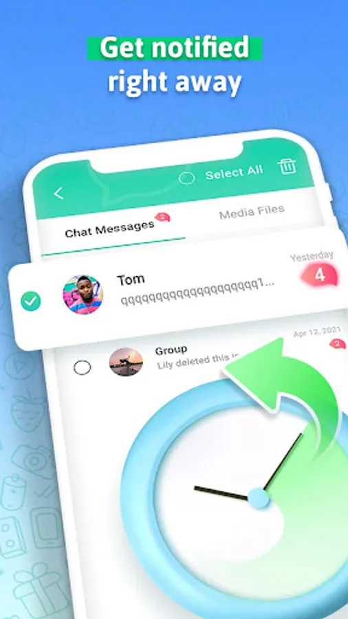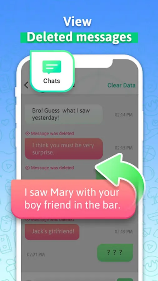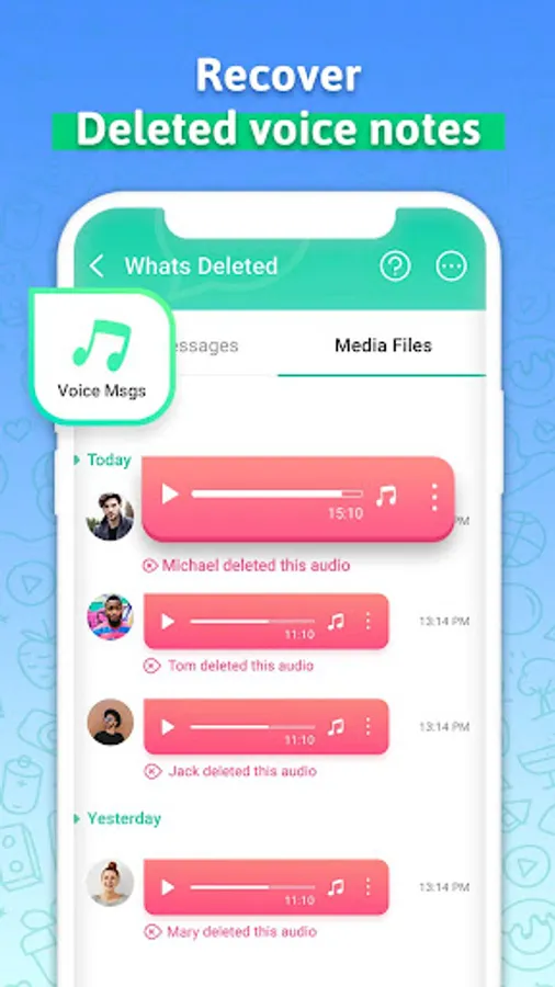 Deleted Chat Recovery - WACR is a tool to help you restore deleted text messages and recover deleted photos, videos, voice notes, audio, stickers and files. By scanning the phone notification history, Delete msg Recovery App is able to detect deleted messages and diaplay them for you in the chat recovery App.