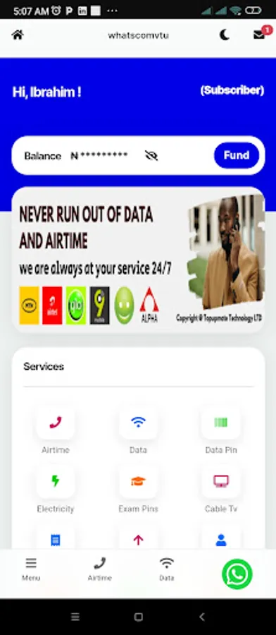 A a web platform where users can purchase Mobile Data Bundles, VTU Airtime, Pay Electricity Bills, TV Subscription. We have designed our website to accommodate user needs. Providing users of our platform the opportunity to save cost, make fast, secured, efficient and rewarding purchases and bill payments. Our internet/mobile data plans work with all devices including Android, Iphone, Computers, Modems e.t.c. Data can be rollover if you re-subscribe before expiry date of current plan.