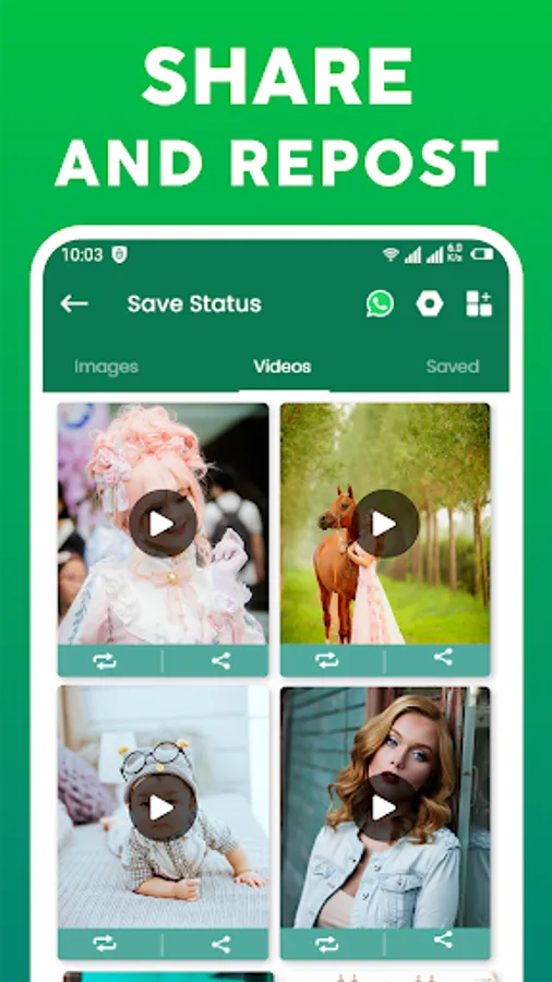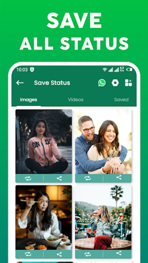 From this Status Saver App, you can directly repost and share all WA statuses to all social media without downloading and also save all types of status from WA GB and WA Business in your device gallery.