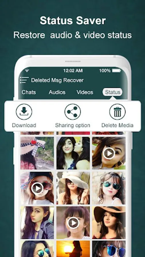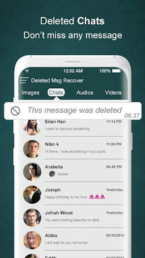 View deleted messages, story saver, restore photos, status saver. View deleted message & status saver is photos, images and chat recovery app. This app provide you the function to restore or undelete messages. Have your friend deleted messages! May be some of them can be very important, so message restore function is always a really good idea. View deleted message & status saver will detect and saves deleted messages, includes text chat, image, video, music etc. It is also helps you to save Statuses Videos and images. You can easily download Video status and images and can view it later by using our app. If you want to view deleted messages that have been deleted by the sender, just download this app (View deleted message & status saver) and you will be notified whenever any message gets deleted by the sender. Just Download this light app to view and share deleted message or media. Read privately and don't miss anything from now on.