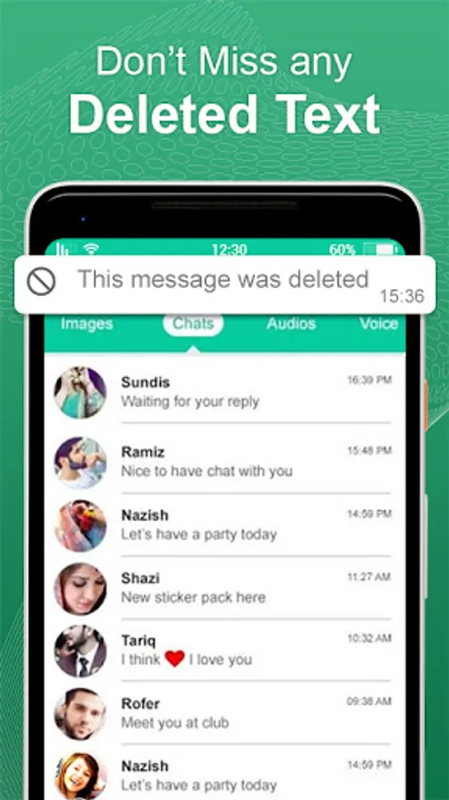 Chat recover for WhatsApp helps you to Recover deleted text messages. View deleted messages and restore deleted text provides you antidelete service that allow the user to save WhatsApp deleted messages that are deleted by the sender. WhatsDeleted Recover Messages will notify you whenever a user deletes a message from WhatsApp.