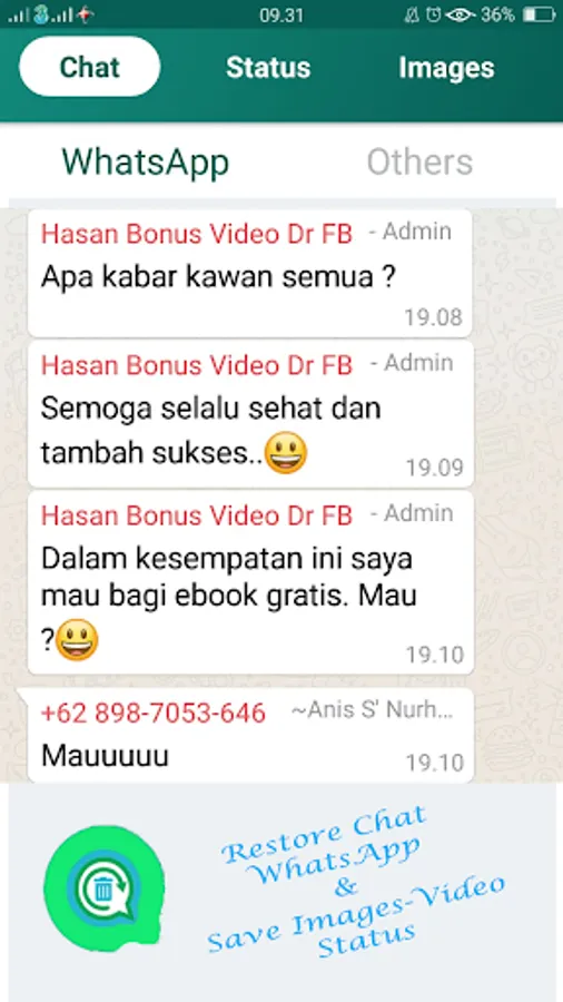 Not only that, you can also download all the statuses on WhatsApp. with one WAMR application: Whats Restore Messages Deleted & Save Status. By using WARM you can monitor messages that are deleted from whatsapp senders. This application will notify you when deleted messages are detected.