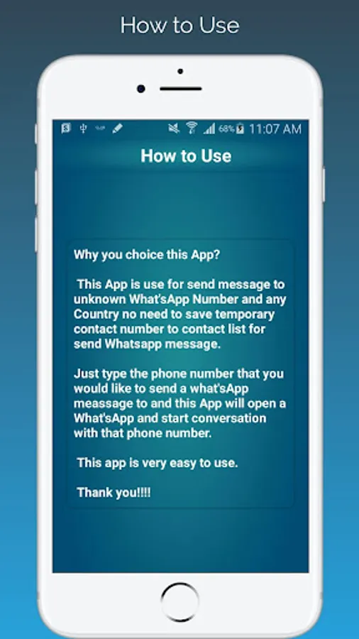 just type the phone number that you would like to send a Whats-App message and this app will open a Whats-App and start conversation with that phone number.