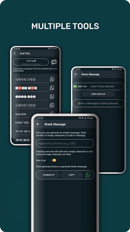 ● With Smart tools you can enjoy premium yet free tools to make Emoji text, Repeated text number of times, blank messages, texting without saving number and many more.
