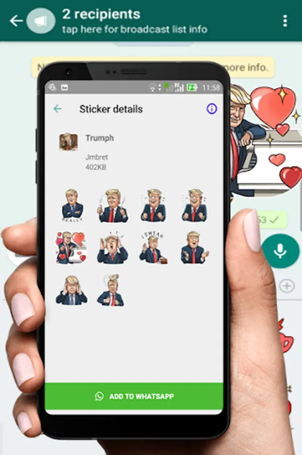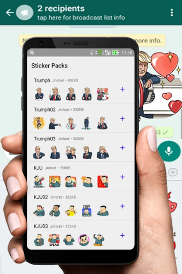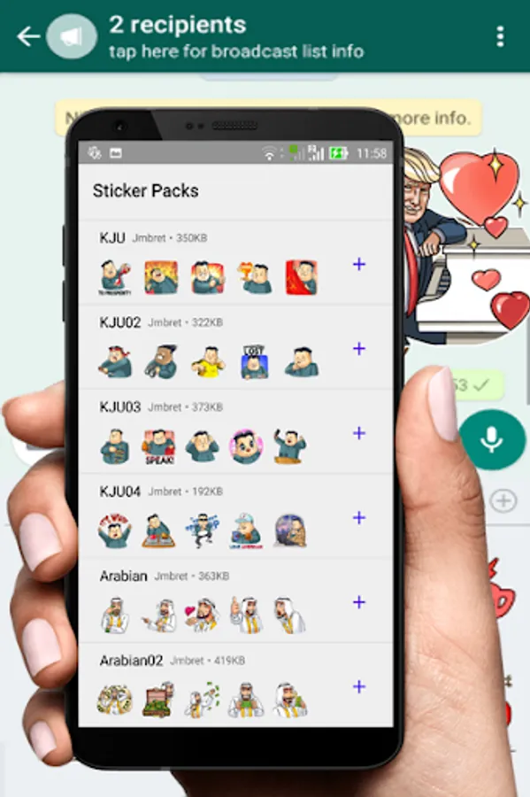 WhatsApp Mr. Trump Stickers is available, so you can sent your expression chat represented by Trumph and Jong Un Characters to your friends. Just download it and start to use these characters all. WhatsApp Trump Stickers App contains some categories and characters, not only Trump but also Jong Un and Arabian Prince.