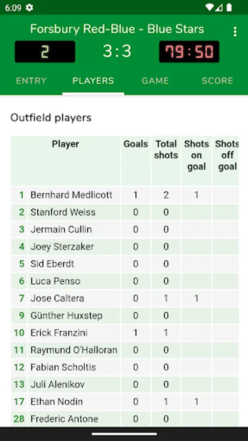 For a complete overview of the whole season, tournament statistics can be generated. They contain all players which played at least one game in this tournament, with number of games played and all actions. Special high scores are highlighted with green and red color, for example to facilitate an immediate identification of the team's internal top scorer of the tournament. Of course also these statistics can be shared via email!