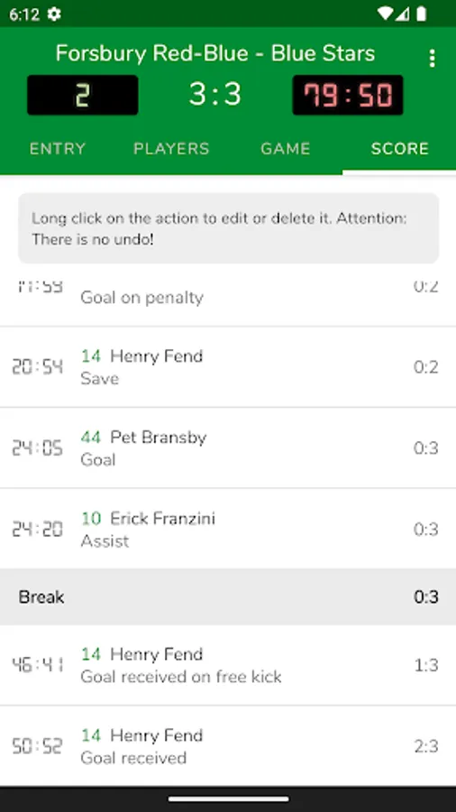 - the complete score of the match, containing every single action, with the match time and partial result at that moment