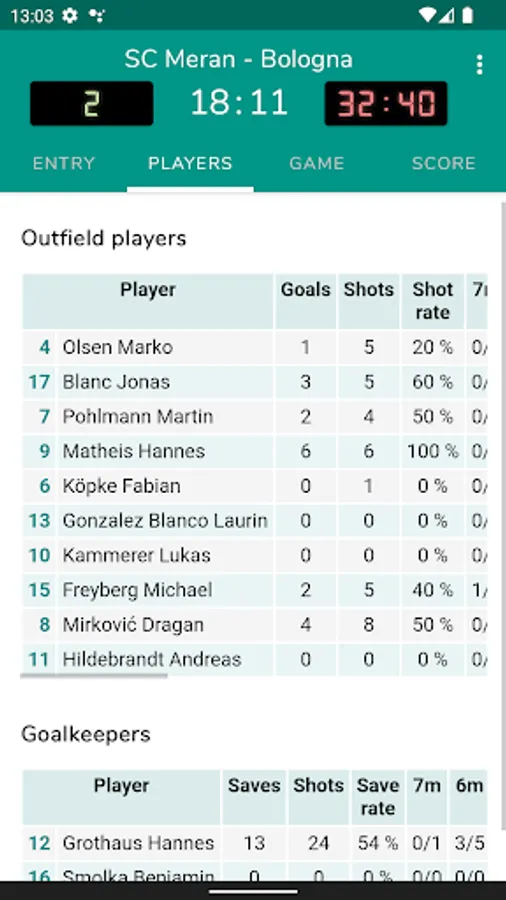 - game stats, with a summary of all actions broken down in first and second half and an overview of the goal distribution (field goals - 7m-goals - goals in counterattack)