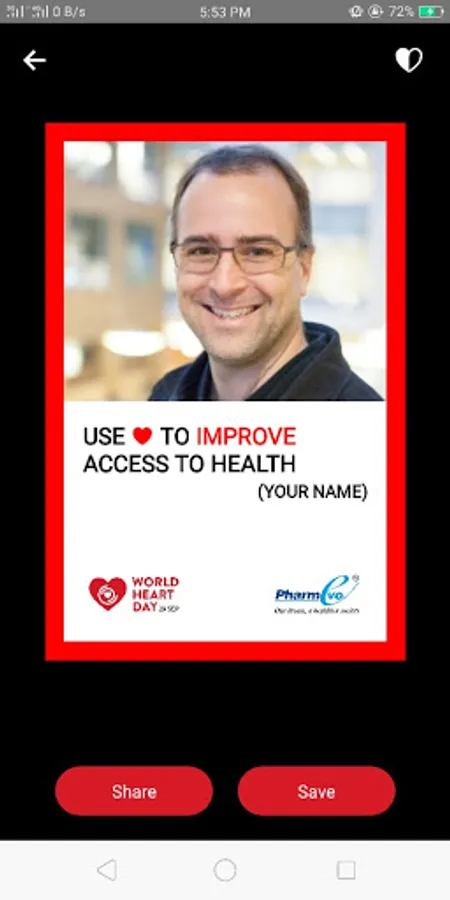 This application has been develop by PharmEvo pvt. Ltd and the objective is to help people create posts for Facebook in accordance with World Heart Day 2020 Theme. The post will contain a picture, a message which needs to be completed (Use Heart to…) and name of the person. The user will have option of develop the post in various different color themes. The user will have option of sharing the post on Facebook or on other social media platforms.